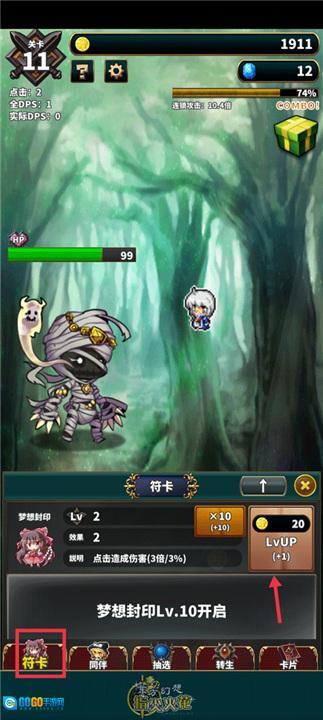 想要提升自身的综合实力,你可以点击“符卡”功能,之后消耗一定数量的金币来提升等级,等级越高,造成的伤害数值也就越高。