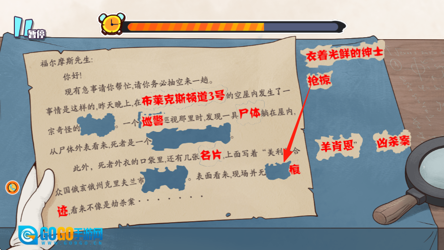 按顺序匹配词汇,完成信纸内容的填充工作;梳理案件相关信息,比如空屋的具体地点、案件发现者、死者随身携带的物品等;通过这些信息辅助推理案件,例如判断案件是否属于劫杀案类型。按照这样的思路,逐步解开侦探推理带来的挑战。