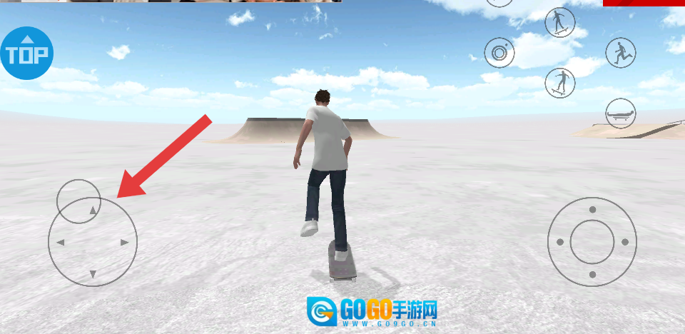 基础滑行的操作方式是借助左下角的方向控制键来控制滑板角色的移动方向,其中向前键能使角色加速滑行,左右键则用来调整滑行的路线。