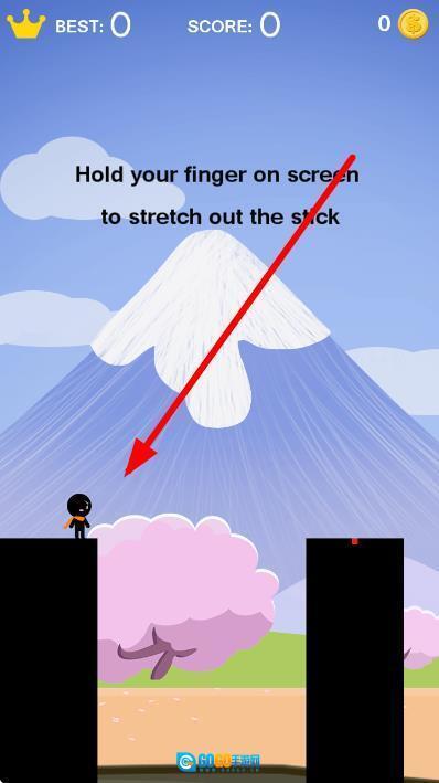 1、进入关卡后,操控小黑人站在悬崖的一头,前方是悬空的另一头,准备按住屏幕让木板开始延长。