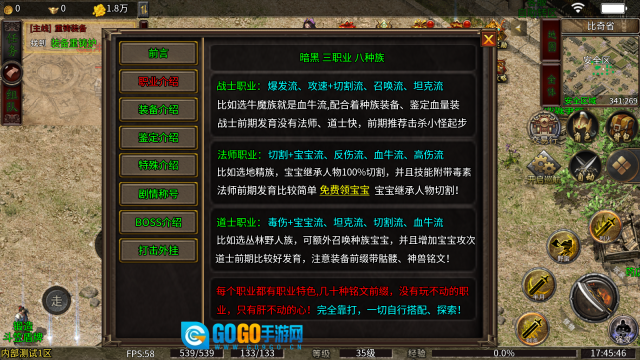 比如选择牛魔族的话,玩法就偏向血牛流,搭配种族专属装备和加血量的鉴定装备;不过战士前期的发育速度比不上法师和道士,所以前期建议先从击杀小怪开始起步。