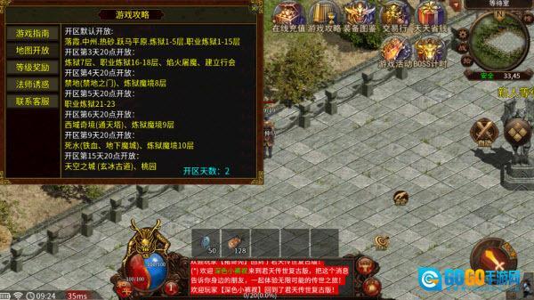 2、开区第三天晚上8点开放以下内容:炼狱七层、职业炼狱十六至十八层、焰火屠魔活动以及建立行会功能。