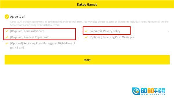 2、进入后是权限服务选择,显示了【Required】的也就是红框中的都是必填选项,分别是游戏须知、年龄和服务条款,其他两个分别是消息推送和游戏通知,选择好后就可以进入游戏开始体验。