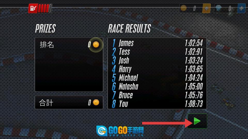 4、赛事结束后,点击结果界面箭头按钮,继续参与后续比赛。
