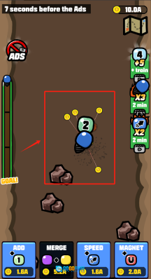 2、点击ADD消耗6A添加带有数字4的物件,7秒后会弹出广告,使用MAGNET花费2A吸附金币,点击MERGE进行合成升级。
