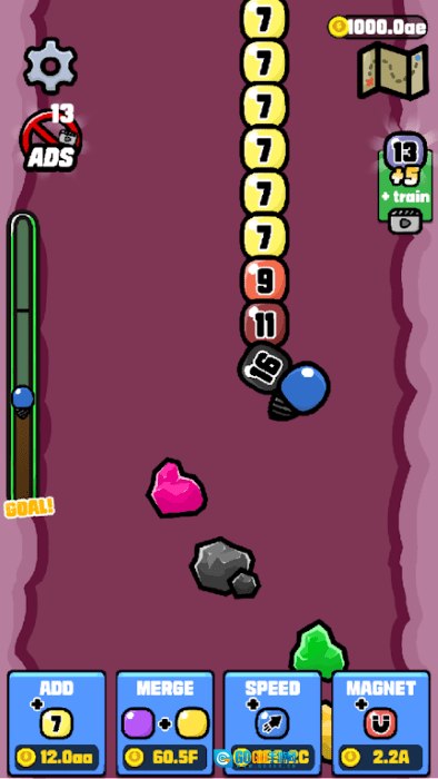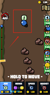 1、点击ADD消耗1.5A添加标有数字1的球,通过MERGE花费5A将相同数字的球合并以完成升级,借助HOLD TO MOVE功能控制移动。