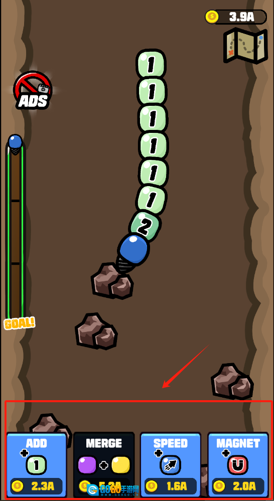 3、点击ADD按钮消耗2.3A添加蓝色球,使用SPEED功能花费1.6A加速球的移动,点击MERGE按钮可合并相同数字的球,当进度条填满时即可达成目标。