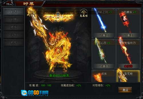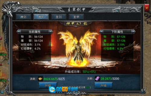 2、幻武、幻甲与斗气能够借助升级进一步提升各项属性;其中幻武和幻甲可通过消耗时装碎片来升级,时装碎片可通过击杀BOSS获取;斗气则需消耗对应的斗气进行升级。