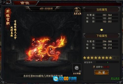 4、官位升星需消耗官职令,提升的属性包括攻魔道、物防、魔御等。官职令的获取途径如下:每日登录签到可获取;击杀任意boss均有概率获得官职令牌;完成剑修之路的主线任务也能获取。