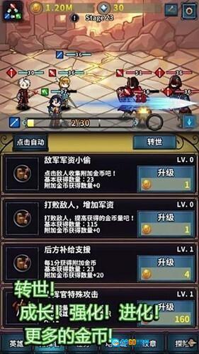 玩家能够借助自动战斗获取金币以强化自身装备,通过积累属性来增强自身实力,利用各类促销活动提升英雄的战力。除此之外,游戏里的不同角色还具备转世功能。