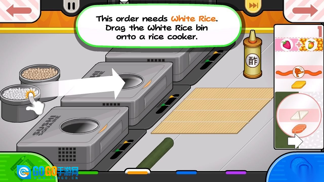 7、按照系统给出的引导提示,点击相应区域,就可以动手开始制作寿司了。