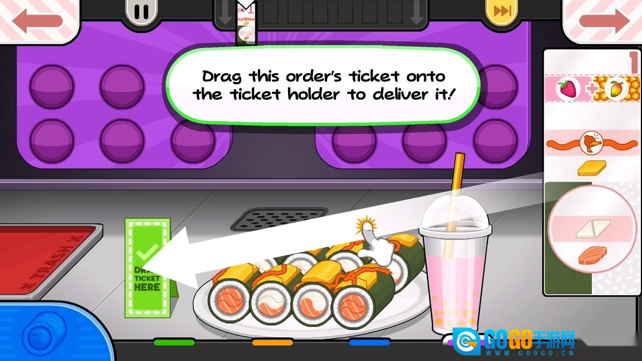 6、屏幕右侧会呈现顾客的详细订单内容,你要依据这些要求来制作相应的寿司与饮品。