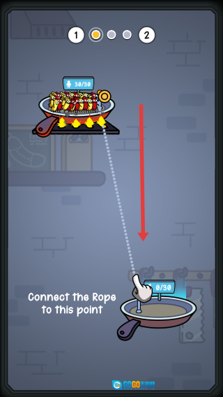 1、进入第一关,按照手指的指引把绳子连接上下煎锅对应的点位,搭建小鸡的转移通道,注意要保证通道稳固。