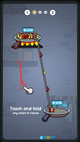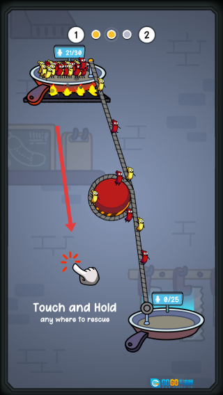 1、规划逃生路线:用手指画线来为被困的香肠人拉扯绳子,这是他们从高地逃生的路线,线条的走向要合理,一定要能引导同伴们安全下滑。