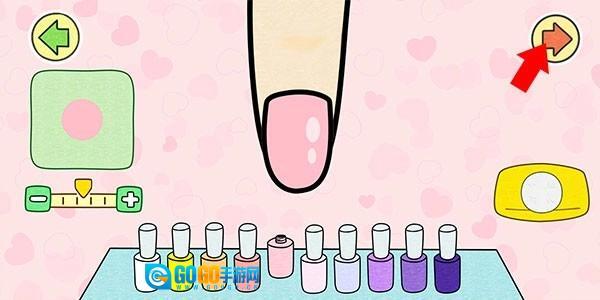 护理结束后,就到了涂指甲油的环节。用户可以按照自己的喜好挑选指甲油来涂抹,涂抹完成后,点击右上角的箭头就能进入下一个阶段。