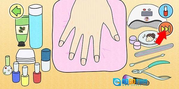 选择后进入美甲界面,按照提示使用指定工具对指甲进行手部护理,点击右上方可快进