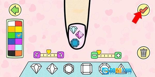 进入装饰物品环节后,点击就能添加选定的装饰物,拖动可调整其位置,左侧进度条用于改变旋转角度,右侧进度条用来调节装饰大小。完成操作后,点击右上角即可结束当前指甲的装饰并回到手部界面。其他手指按照上述步骤进行装饰,最后点击右上角的勾号,就能完成此次装饰。