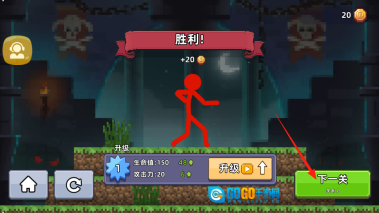 3、顺利通过关卡1,获取金币奖励后,检查下属性是否还有提升的余地。要是想升级就点击升级按钮,等准备好挑战新关卡了,就按下一关按钮,让小红人前往关卡2,继续与更多怪物展开战斗,解锁全新的挑战内容。