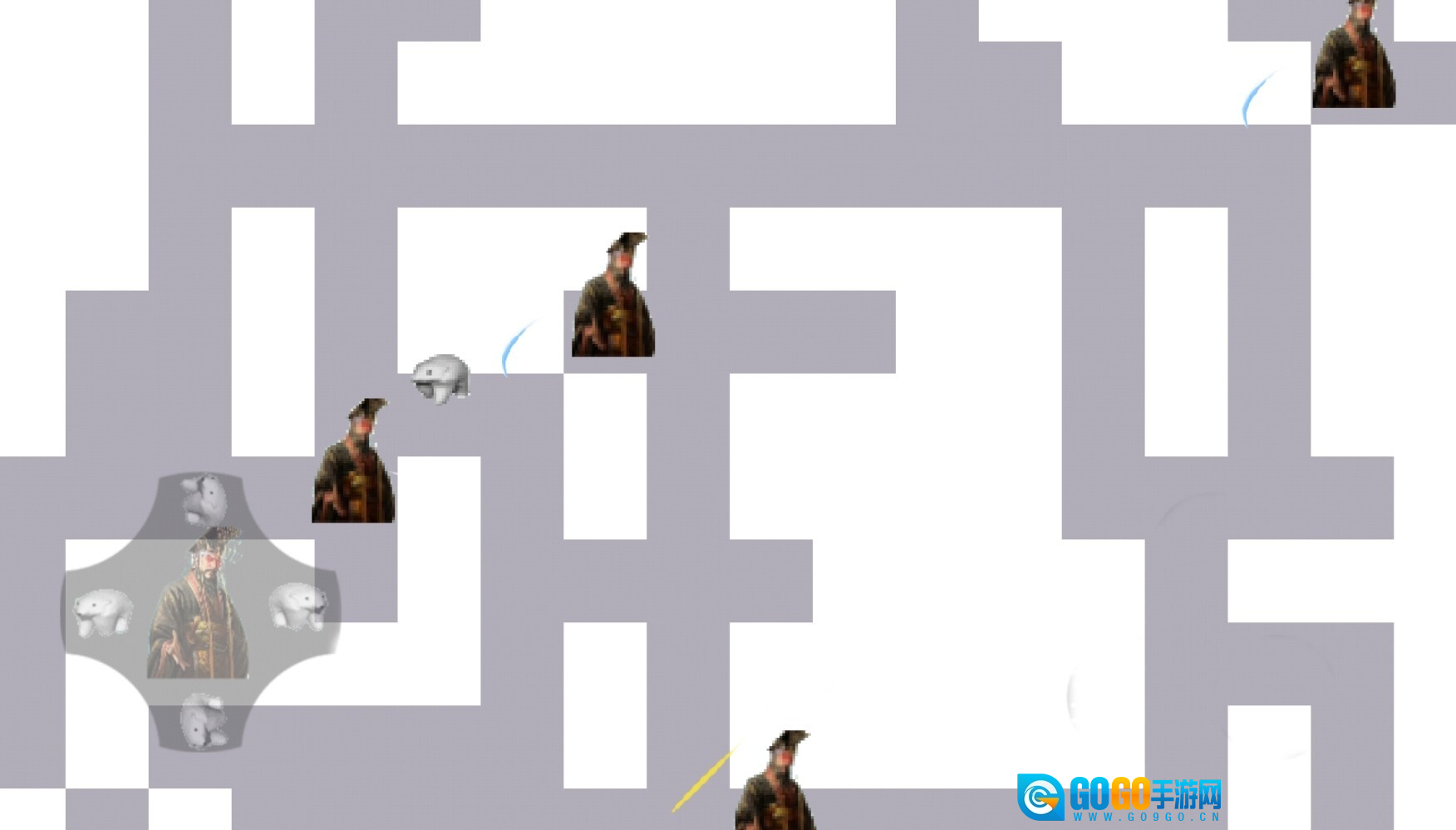 3、左下角设有虚拟摇杆,可用来操控北极熊进行上下左右的移动,在此过程中需要躲避秦始皇的追击,只要找到迷宫的大门并将其打开就能顺利通关!