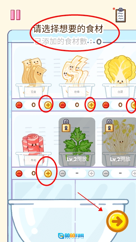 7、将采购好的食材依次放入,操作完成后点击继续