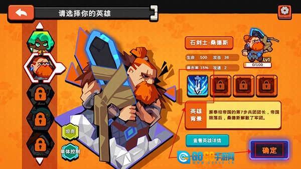 2、进入关卡前,玩家需要挑选一位英雄,点击英雄可查看其技能详情,确认选择后就能开启冒险之旅。