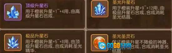 9-12级升星需使用圣光升星石,且需要圣光圣灵石提供保护,另外,4个极品升星石可以合成1个圣光升星石。