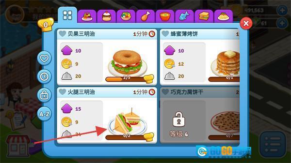 1、在菜品界面选中【火腿三明治】,这款菜品需要消耗【15个紫币】和【24个金币】,制作所需时长是1分钟。
