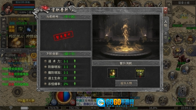 2、官职晋升:消耗元宝与官印碎片便能提升,可增加杀怪的爆率。