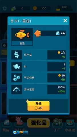3、对小鱼进行升级以提升其等级,能够增加整体产量并加快游泳速度,而获取收益需通过售卖氧气瓶来达成。