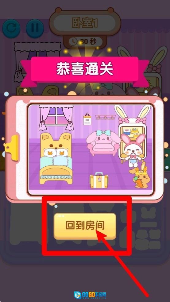 3.通关提示清晰:完成拼贴任务后会出现“恭喜通关”,点击“回到房间”按钮可快速返回,操作流畅直觉。