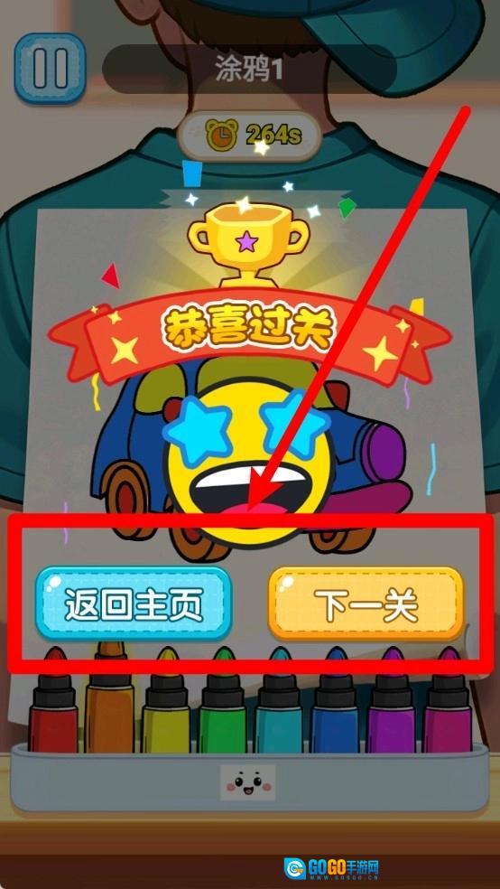 3.完成关卡:任务完成后会显示过关提示,玩家可选择返回主页重新开始,或点击下一关继续新的绘画挑战内容。