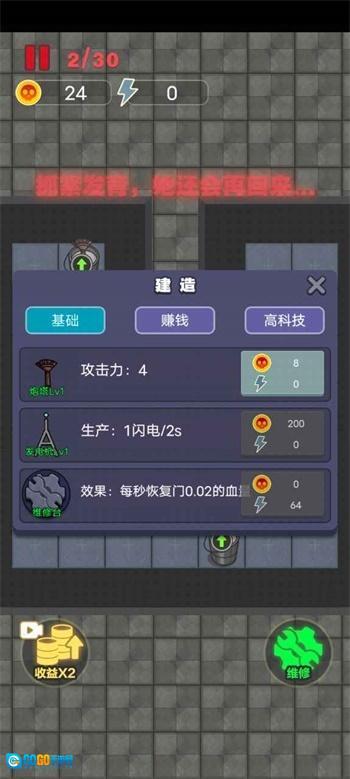 2、你能够建造一座“维修台”来恢复门的血量,也可以搭建“冰箱”以减缓鬼的攻击速度,还能修建矿产来提升自身的金币产出速度;