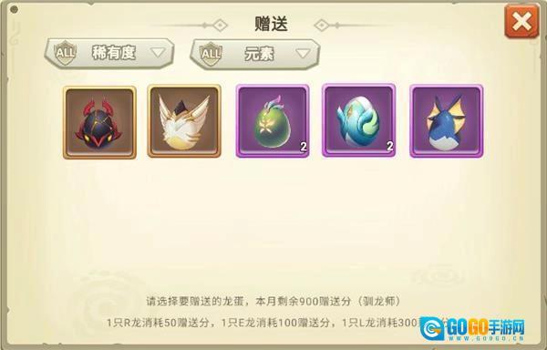 提升和好友的亲密度,能让亲密度等级得到提高。当亲密度处于2级及以上时,好友之间就能互相赠送龙蛋了。亲密度等级越高,好友每月可赠送的龙蛋分值上限也会相应提高。不过玩家每个月最多只能获取500分的龙蛋礼物。其中,R龙的分值是30分,E龙为100分,L龙则是300分。
