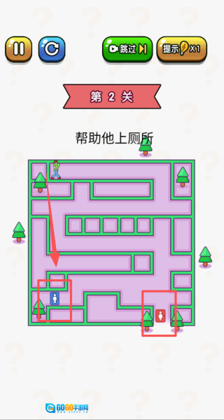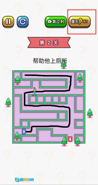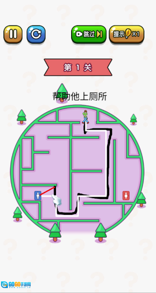 2、拿画线上厕所这个例子来说,进入第一关后,需要通过合理画线来完成帮助角色上厕所的任务。