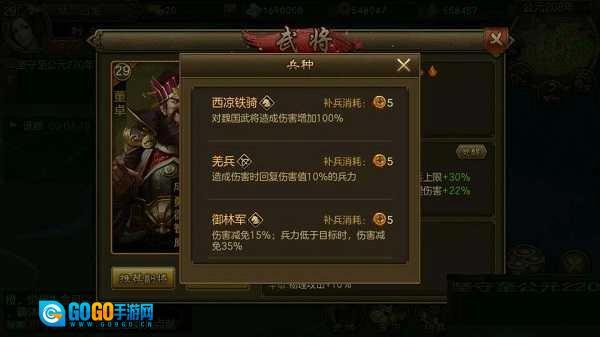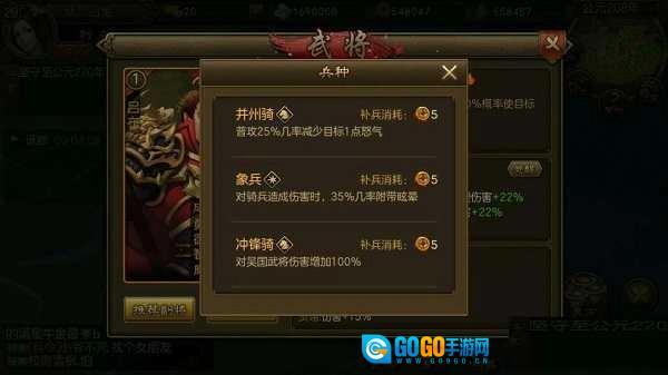 推荐:藤甲兵(目前使用物理武将的玩家比较多,像赵云、许褚、太史慈、吕布这类,这个兵种具备抵挡伤害的效果)