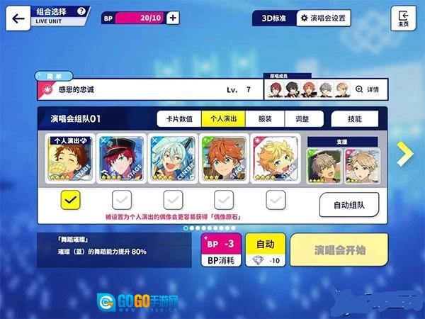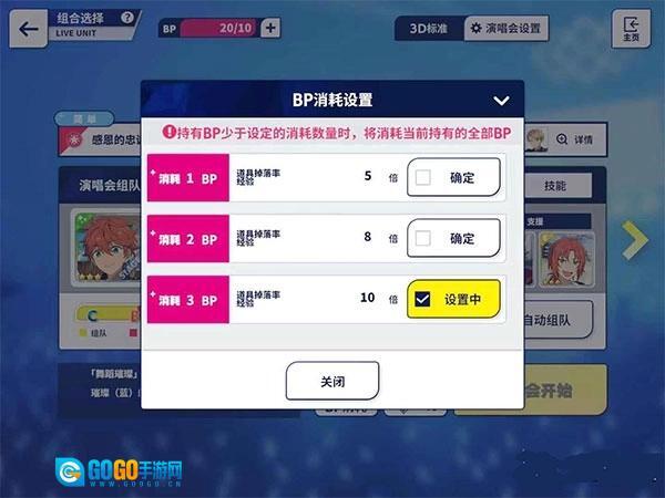 2、接着准备好你计划刷原石的偶像,对其等级及各方面能力进行一定提升,粉丝数量也可以在偶像的工作过程中同步刷取。之后进入演唱会界面,点击进入演唱会,选择掉落加倍的歌曲(当前若有活动会使某首歌曲掉落加倍),此时在下方的BP数量处点击一下,将其调整为3倍掉落,还要记得把目标刷原石的人物放置在中心位置,随后开始演奏。