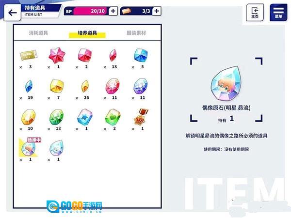 1、首先原石包含多种类型,有普通的大中小矿石、卡片颜色矿石、技能矿石、花朵勋章、MV矿石以及偶像专属宝石。偶像专属宝石用于解锁偶像之路的服装、开花等内容,并且不同偶像仅对应各自专属的偶像原石,需刷取对应原石才能解锁技能,是相当重要的资源,接下来我们看看具体该如何刷取偶像原石。