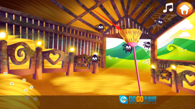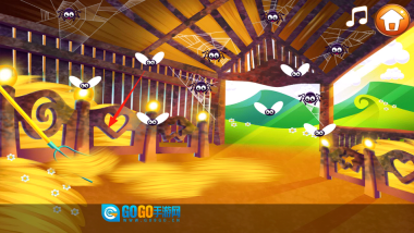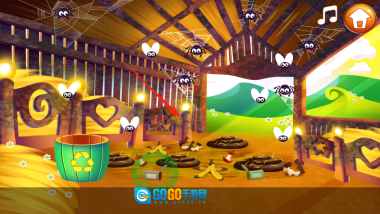 1、进入谷仓场景,只见里面散落着垃圾,苍蝇四处飞舞,还有蜘蛛出没。看到地上的瓶子和香蕉皮后,用手指将它们拖到绿色回收桶里,清理这些垃圾,让谷仓恢复整洁,过程中还可以顺手驱赶乱飞的苍蝇。