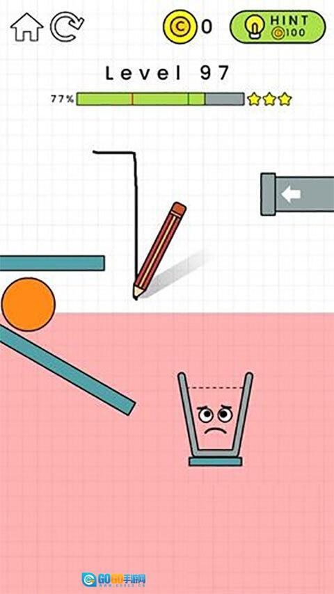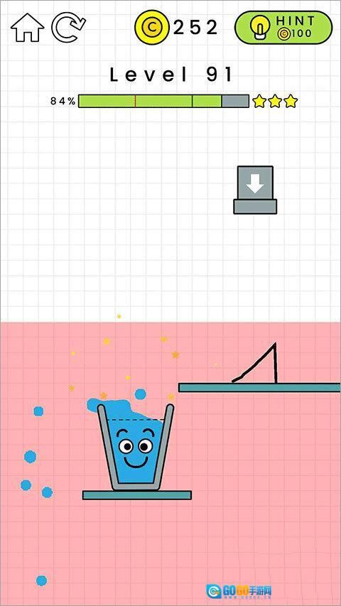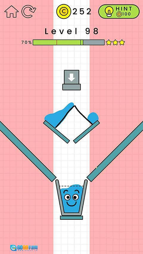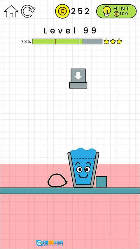 第99关的通关要求是画出一个物件,让玻璃杯重新立起来,这样就能顺利接到水了。