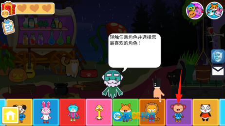 2、进入角色选择界面后,轻点带有紫色方块标识的猴子角色,完成选定操作后即可开启游戏探索环节,请点击该角色完成选择。