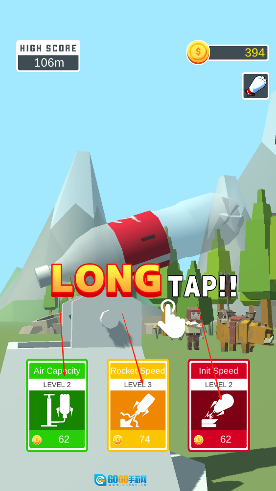 3、在游戏开始前,金币奖励可用于升级空气容量、瓶子速度和初始速度,这些升级能帮助瓶子飞得更远,从而获取更高奖励。