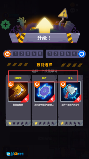 2、通过击杀僵尸来积累经验,每次升级后可以从回旋镖、锯片这类技能里挑选一项进行学习。