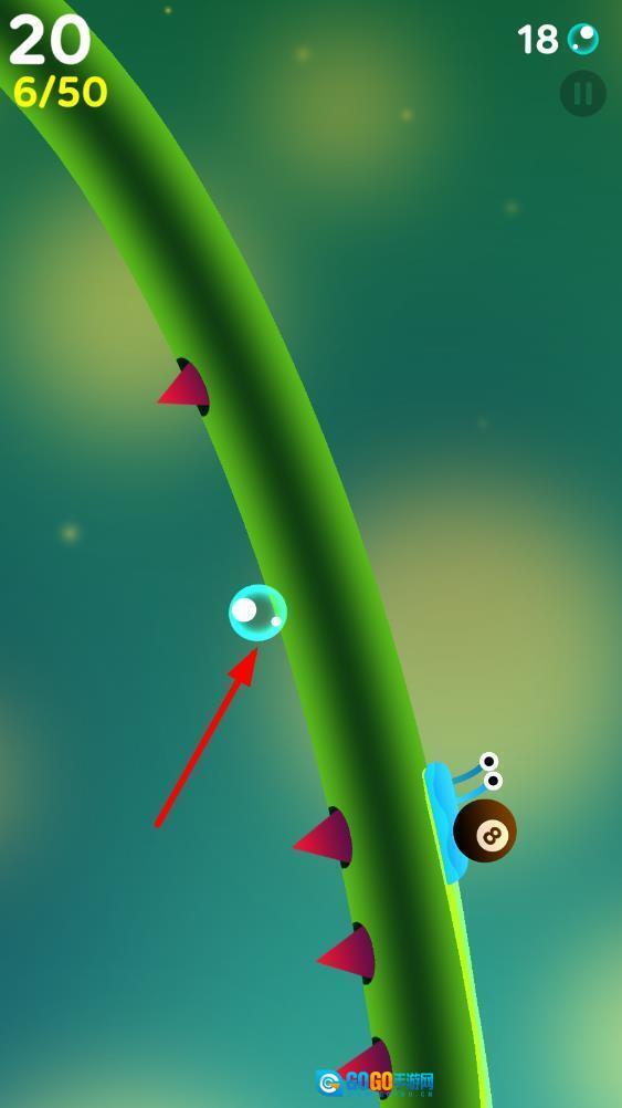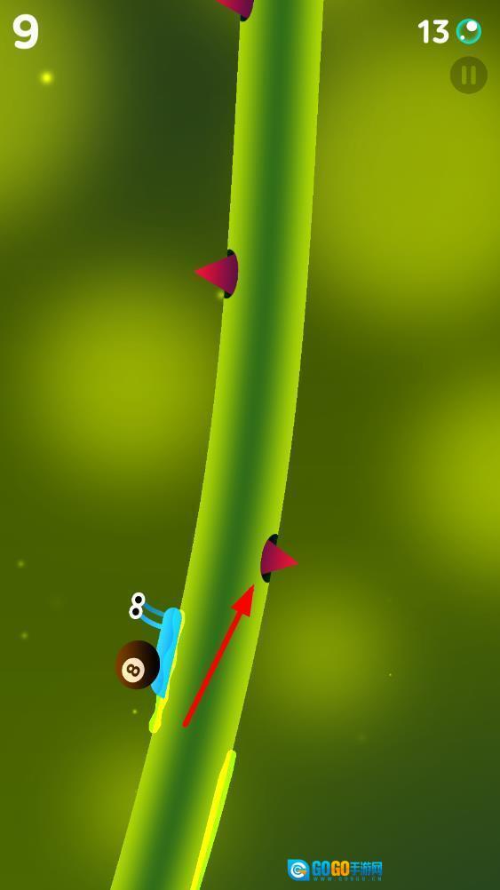 2、在冒险过程中,要留意前方凸起的钩刺,通过点击屏幕来操控蜗牛切换到侧面以躲避危险,与此同时,还需注意收集路上的水泡,保持闯关的节奏。