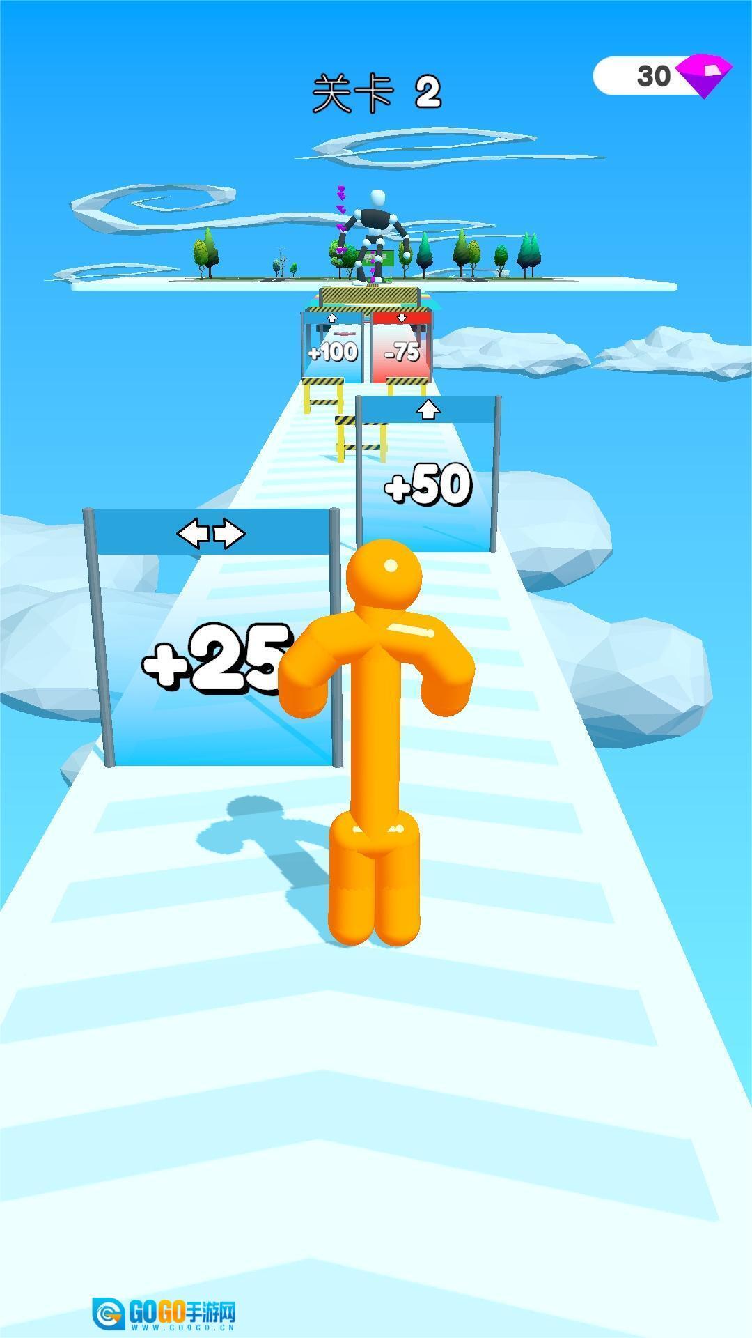 1、控制果冻人在关卡里奔跑,收集各类道具,让它的身高和腰围不断增加,从瘦弱的模样一步步变成高大又勇猛的将军。