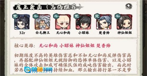 核心英雄推荐无心和尚、小昭妹、神仙姐姐和楚香帅。初期阶段,练度较低的英雄们加起来的伤害,都比不上无心和尚的反弹伤害;再配合神仙姐姐无视防御的超强单体伤害,以及小昭妹带来的全体攻击加成,就能保证队伍输出大量伤害。要是这时候再加上楚香帅的持续回血效果,那输出排名拿第一就不是空想了。