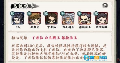 核心侠客:丁老仙、白毛狮王、银轮法王。当玩家推进至400关时,敌方妖怪的各项属性会迎来显著提升,而作为队伍核心输出的丁老仙,此时便成为《自创武林》中不可或缺的橙色侠客——他的技能能够对敌方全体单位造成当前生命值6%的伤害。这套阵容的优势在于,丁老仙仅凭技能就能输出高额伤害,且培养所需的资源极少;不过其短板也很明显:白毛狮王与银轮法王的获取难度相对较高,好在丁老仙可以通过积累招募积分兑换获得。