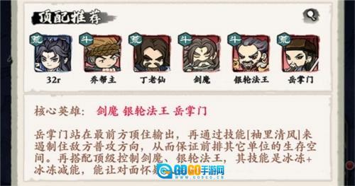 核心英雄为剑魔、银轮法王与岳掌门。岳掌门需顶在队伍最前排承受伤害,利用技能“袖里清风”限制敌方普攻的目标方向,以此为前排其他队友争取生存空间。再配合拥有强力控制效果的剑魔和银轮法王——二者技能可实现冰冻与冰冻减能的双重控制,足以让敌方陷入难以应对的困境。