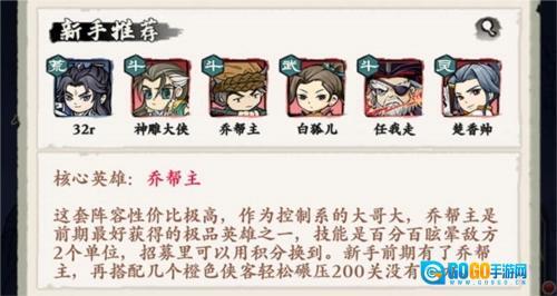 核心英雄为乔帮主。这套阵容的性价比十分突出,乔帮主作为控制系的顶尖存在,是前期较易获取的优质英雄之一,其技能能够对敌方2个单位实现百分百眩晕效果,可通过招募系统用积分兑换得到。新手在前期若拥有乔帮主,再搭配几位橙色侠客,轻松通过200关毫无压力。