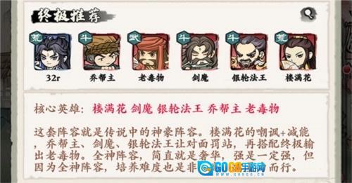 核心英雄包括楼满花、剑魔、银轮法王、乔帮主和老毒物。这套组合便是大家口中的神豪阵容。楼满花能嘲讽敌人并削减其能量,乔帮主、剑魔与银轮法王可使对手陷入无法行动的罚站状态,再加上作为终极输出的老毒物,整套全神阵容堪称奢华至极。实力强劲是毋庸置疑的,但由于是全神卡配置,培养起来难度极大,建议根据自身情况谨慎选择。