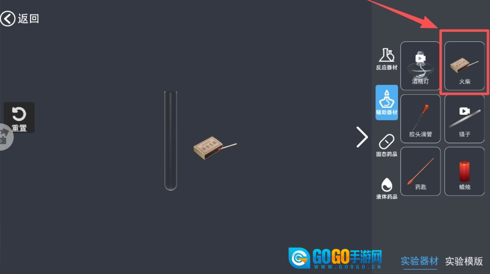3、在实验界面里,点击“火柴”之类的实验器材,即可启动实验操作,对真实的实验过程进行模拟。